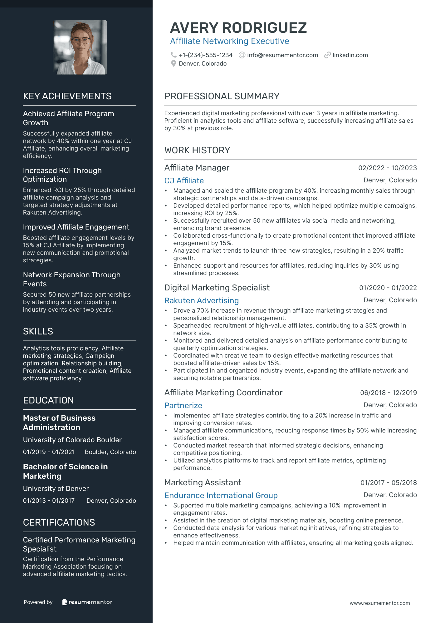 A results-focused Affiliate Marketing Executive resume summary should clearly showcase your key skills and accomplishments. Emphasize your strengths in driving traffic and boosting sales. Consider this example for inspiration: