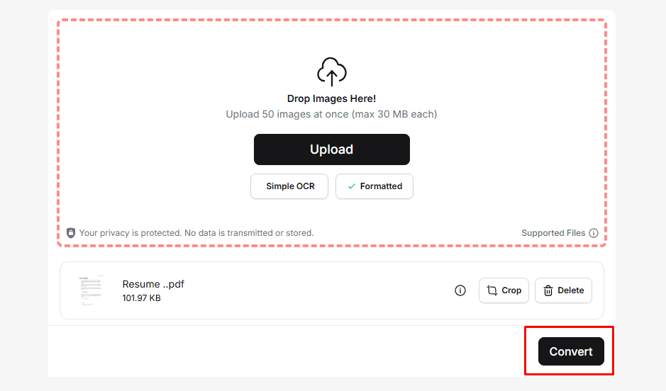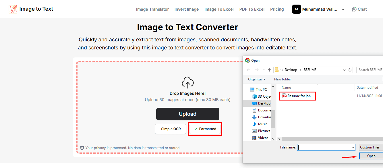 Before uploading your file, select the “Formatted” feature of the tool. This helps keep the formatting intact after file conversion. After this, select your scanned resume file and hit the Upload button.