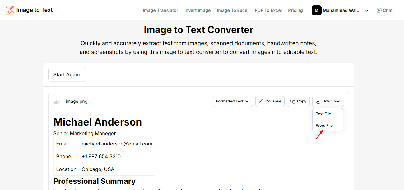After clicking the Word file, your file will start downloading immediately. This is how you can use an online OCR converter to turn your scanned resume into an editable Word document. It is especially useful when the image is a little blurry or if the formatting is not perfect.