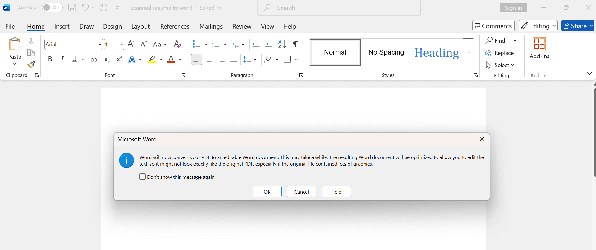 Once you select your scanned resume file, a message will pop up informing you that your converted file might not look exactly the same as the original file, especially if it contains a lot of graphics. In most cases, however, the conversion goes smoothly for text-based content. Click “OK”.