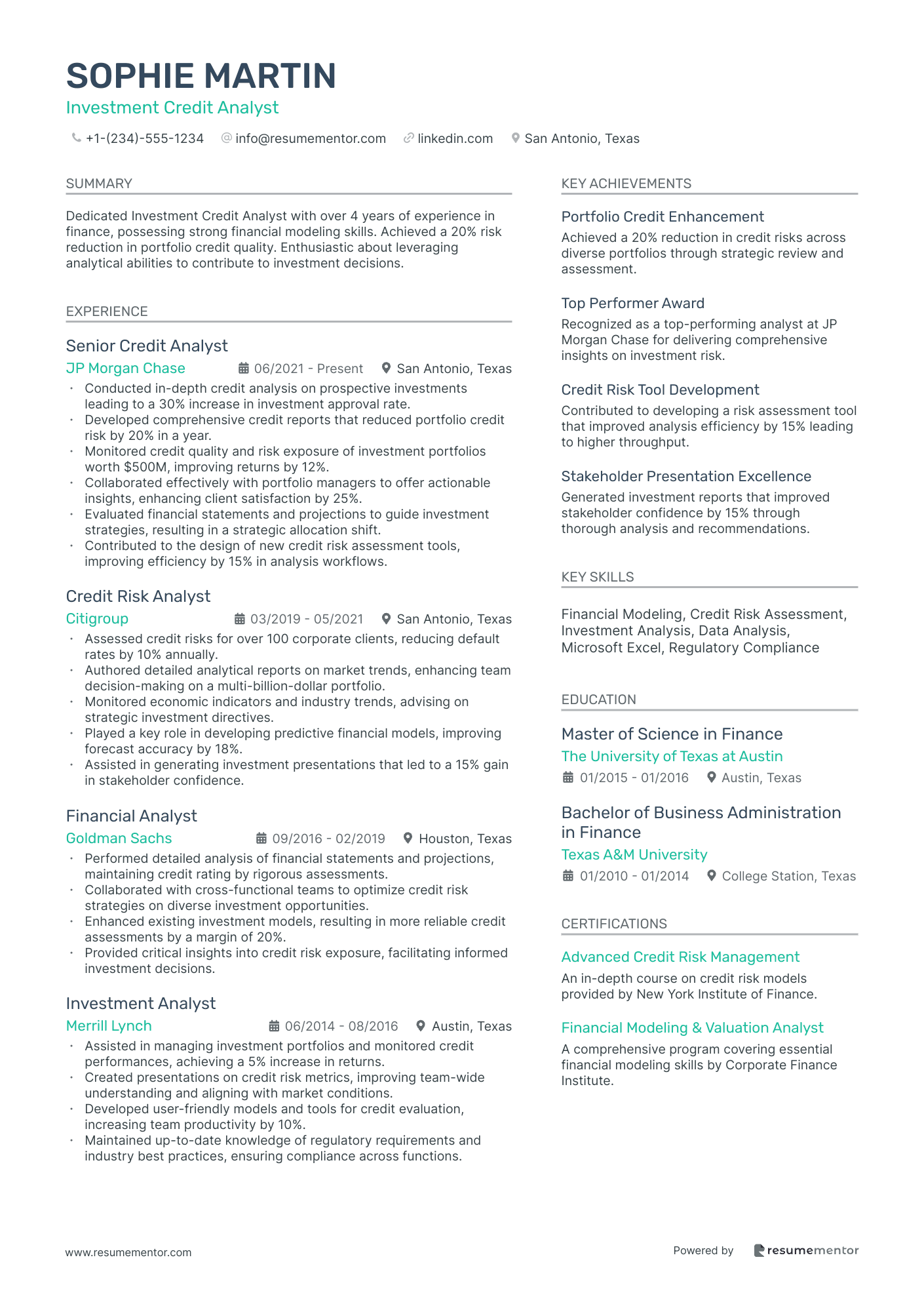 Consider this example of a credit analyst resume experience section that effectively brings these elements together: