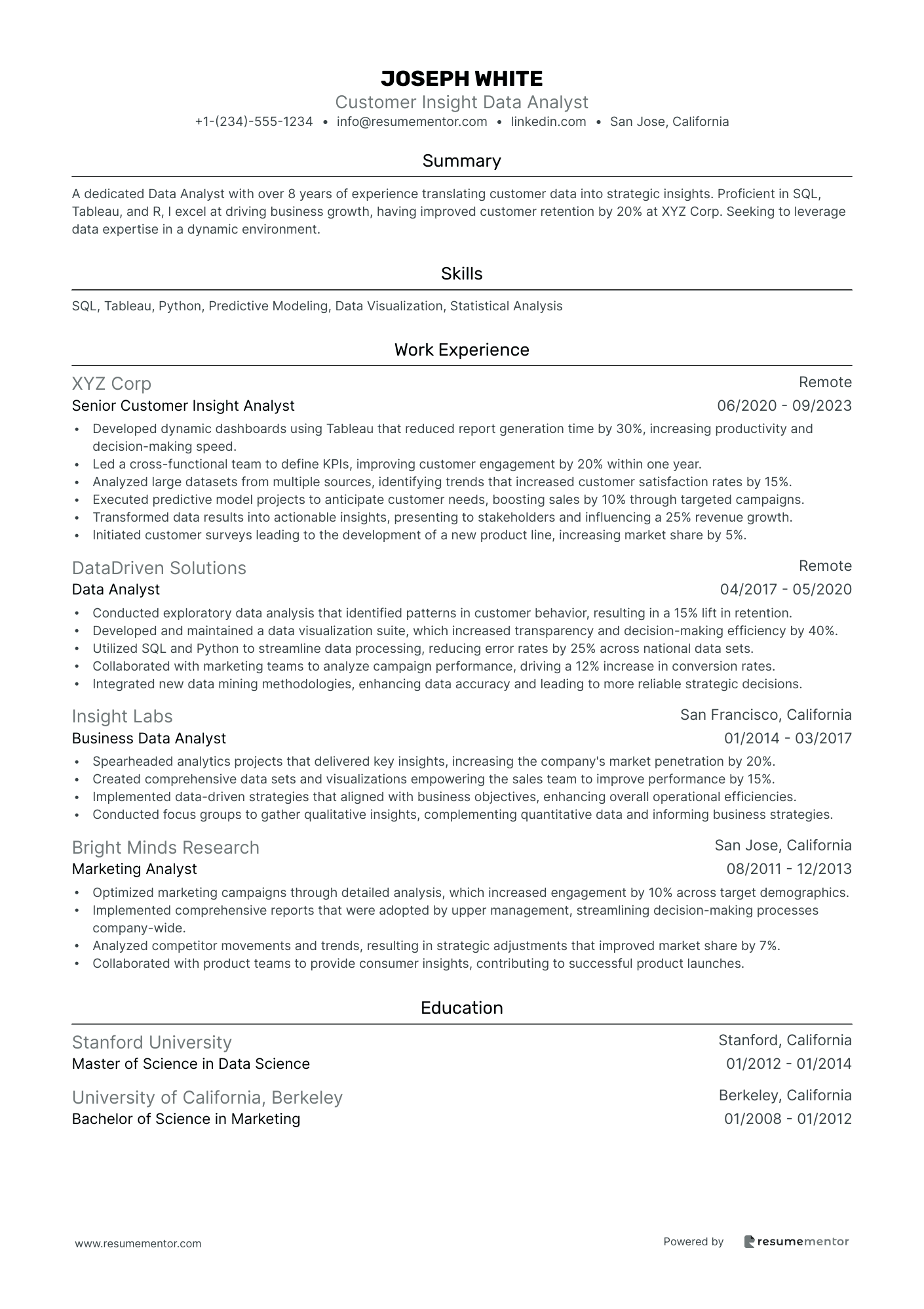For a data analyst resume, the best format is the reverse-chronological resume. This format highlights your most recent experience first, making it easy for hiring managers to see your current skills and achievements. Use modern fonts like Rubik or Montserrat for a contemporary look instead of outdated ones like Arial or Times New Roman. Always save your resume as a PDF to ensure it looks the same on all devices. Keep your margins at one inch on all sides to maintain readability and a clean look. Clearly label each section with headings like "Work Experience" and "Education" to help Applicant Tracking Systems (ATS) easily identify and categorize your information.