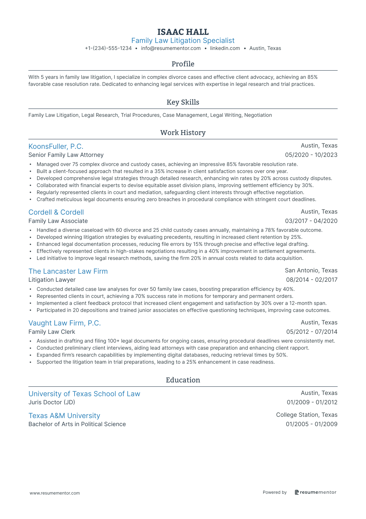 A family law-focused resume summary section should effectively showcase your experience, skills, and values. For attorneys with significant experience, the goal is to highlight strengths and key achievements clearly. For example, consider this summary for a family law attorney: