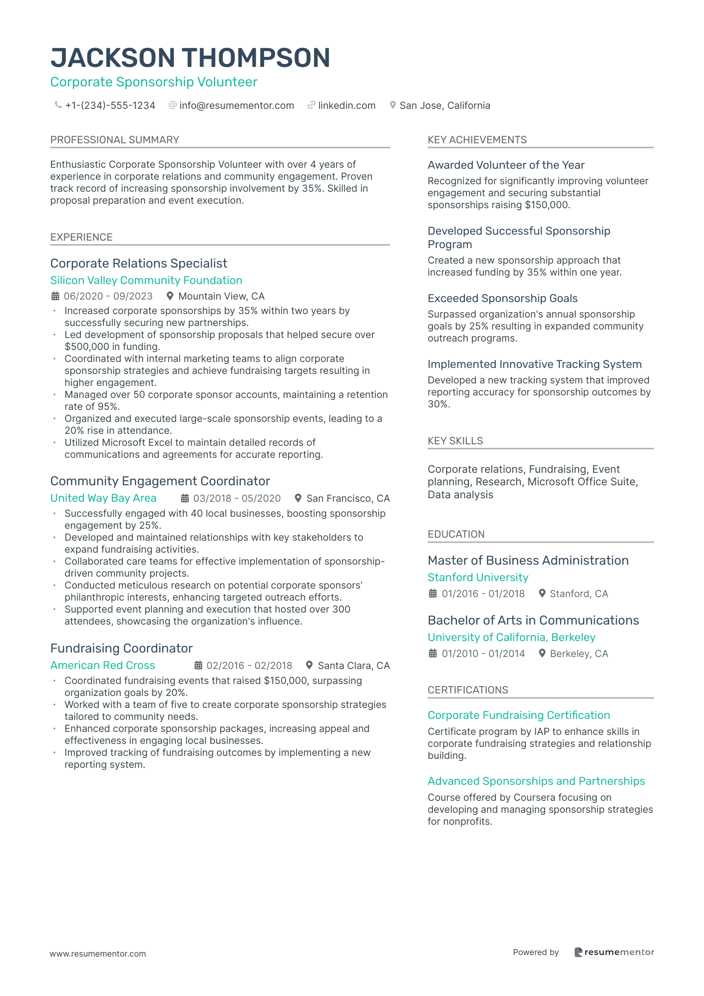 A strong fundraising volunteer experience section highlights your achievements and the impact you've made. Start by organizing your roles in reverse chronological order, putting recent and relevant positions at the forefront. Stay focused on fundraising and volunteer positions while keeping your history within the last 10-15 years for brevity. Tailor your experience to align with the job ad by weaving in specific keywords and necessary skills. Employ action words like "led," "boosted," "organized," and "enhanced" to communicate your accomplishments vividly. This method effectively underscores the value you've contributed in past roles.