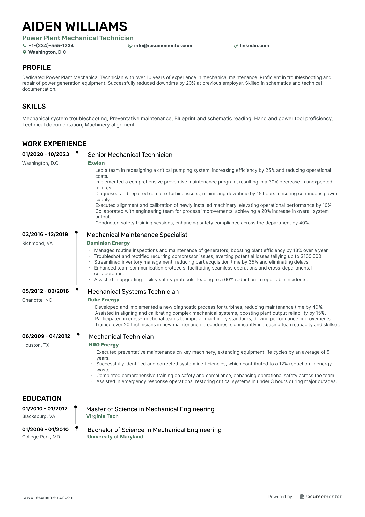 This example effectively ties together your role, location, and achievements with measurable outcomes. Each bullet point not only highlights your technical skills but also shows how you made a direct impact, benefiting the company as a whole. Tailoring your resume in this way, with quantifiable achievements, paints a comprehensive picture of your value as a mechanical technician, enabling employers to quickly see why you’re a strong candidate.