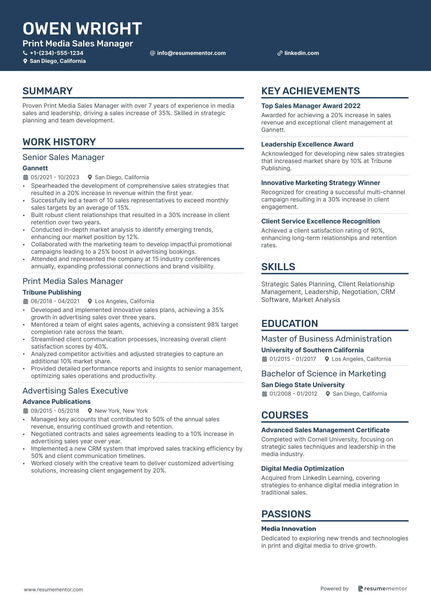 This experience section excels by coherently connecting impactful and quantifiable achievements directly related to media sales. Each bullet point starts with a potent action verb and clearly showcases achievements, highlighting your ability to drive revenue and maintain strong client relationships. By tailoring the content to align with sought-after skills in media sales, you ensure that your experience resonates with employers. The clear structure and cohesive narrative make it easy for employers to see your potential at a glance, reinforcing your candidacy for the role.