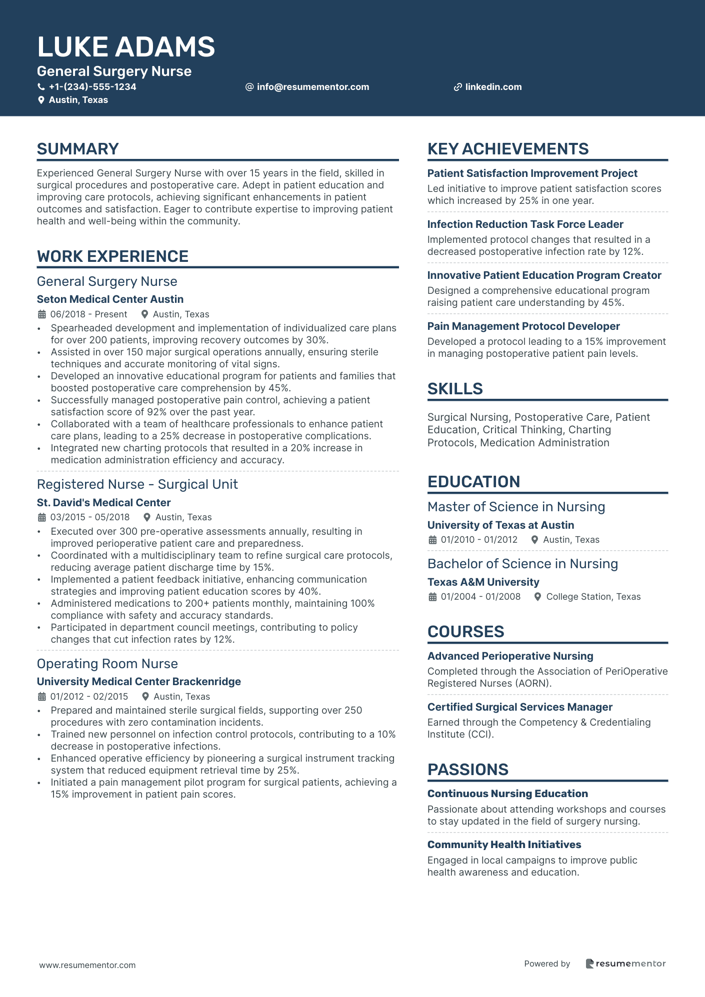 This summary effectively showcases your key skills, experience, and passion for nursing by mentioning specific expertise like post-operative care and patient education, which are critical in this role. Highlighting communication abilities adds depth, showing that you can collaborate effectively, a must in healthcare environments. Further, demonstrating a commitment to staying updated with the latest practices underscores your dedication to professional growth. Using words like "dedicated" and "skilled" convey energy and competence, making your resume stand out and instilling confidence in your abilities.