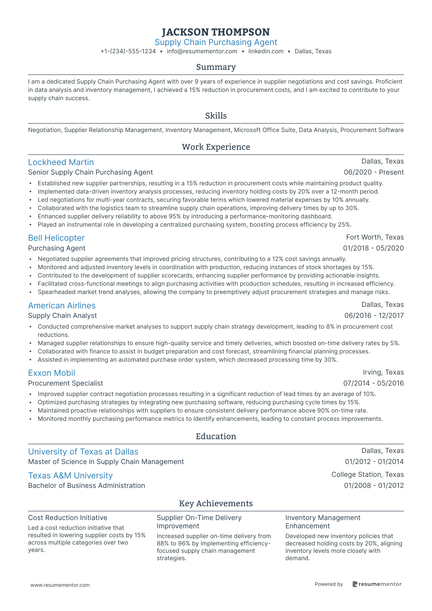 A strong purchasing agent resume experience section centers on communicating your impact in previous roles through specific achievements. Start by listing your most recent job and work backwards, covering the last 10-15 years or highlighting three to four relevant positions. Use job titles that accurately reflect your responsibilities and achievements, tailoring each entry to the job you’re applying for by integrating relevant experiences and keywords from the job description. The use of action verbs such as "negotiated," "optimized," and "reduced" adds clarity and impact to your accomplishments.