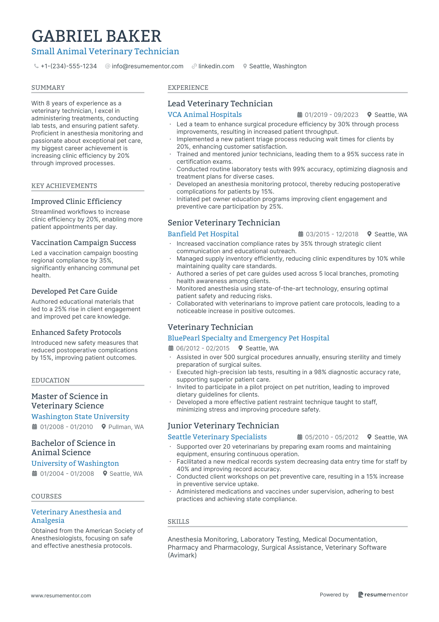 By tailoring your resume specifically to the veterinary industry, you communicate your understanding of the field and the value you can bring. This focused approach makes your resume not only a list of your accomplishments but a story of your professional journey.